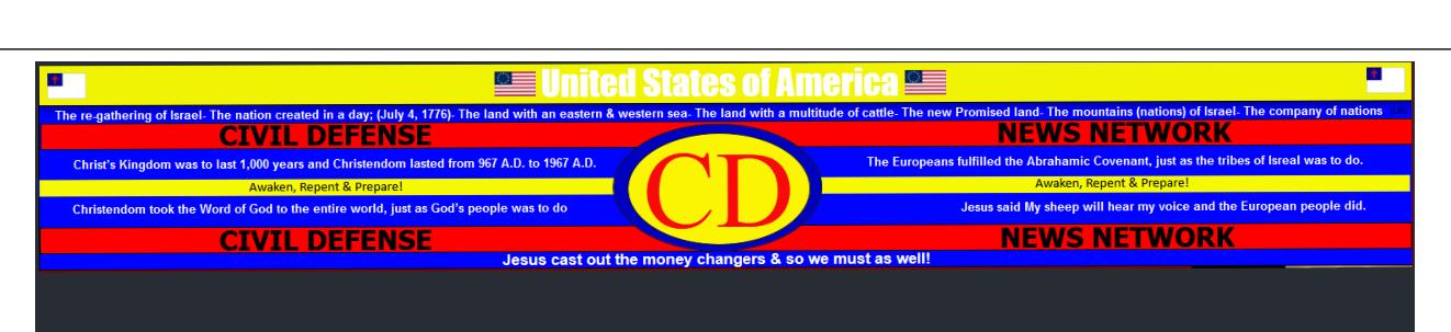 United States of AmericaThe re-gathering of Israel- The nation created in a day; (July 4, 1776)- The land with an eastern & western sea- The land with a multitude of cattle- The new Promised land- The mountains (nations) of Israel- The company of nationsCIVIL DEFENSECIVIL DEFENSENEWS NETWORKNEWS NETWORKCDJesus cast out the money changers & so we must as well!Awaken, Repent & Prepare! Awaken, Repent & Prepare!